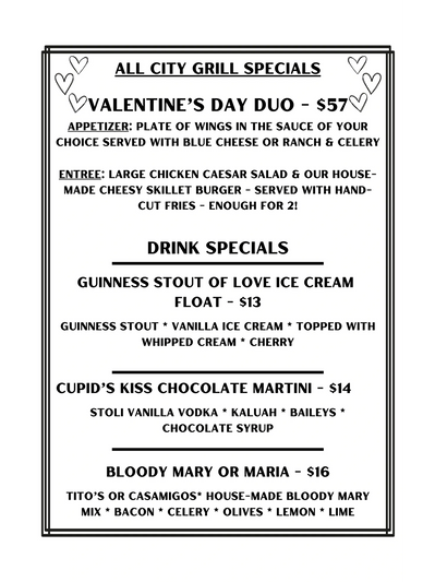 Join us this Friday (2/13) & Saturday (2/14) at All City Grill for a date night done right. Delicious food, great vibes, and drinks for all tastes